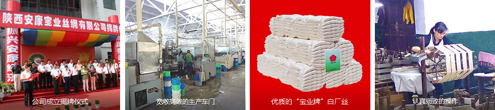 陜西安康寶業(yè)絲綢有限公司始建于1958年。是由原安康市國有企業(yè)改制而成的中型民營企業(yè)。公司地處秦嶺南部,氣候濕潤,風(fēng)景宜人,有得天獨(dú)厚的自然條件非常適宜于種桑養(yǎng)蠶,是全國重要的優(yōu)質(zhì)蠶桑生產(chǎn)基地之一。 公司技術(shù)力量雄厚,裝備精良,擁有較先進(jìn)的自動繅絲機(jī)6000緒/15組,年產(chǎn)桑蠶白廠絲600噸。